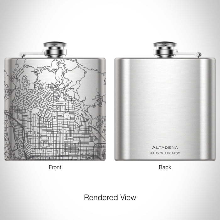 Custom engraved map of Altadena, California and coordinates on 6oz hip flask. Includes canvas bag and funnel. Measurement - 5in x 1in x 4in.
